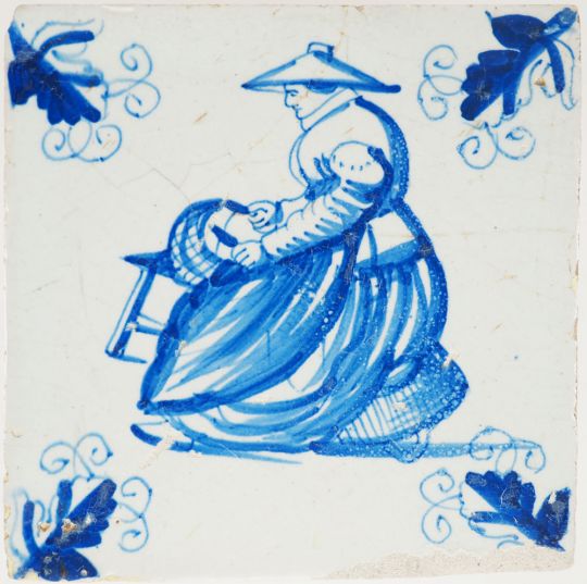 This Delft tile was made around 1650 and depicts a woman making a basket. It is a scene that we have not seen before, so before publishing it online we contacted Jan Pluis about it. Together we came to the conclusion that the scene most likely depicts a woman making baskets. Small ones that could easily be carried and which could be filled with apples or potatoes. The tile is decorated with 'oak leaf' corner motifs and is overall in a good condition with just a covered up chip on the lower right corner.