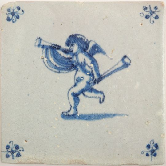This antique Delft tile, dating from around 1660, depicts Cupid blowing a trumpet. It is a scene that seems to be inspired by how angels are depicted in the 'Last Judgment'. The tile is decorated with 'spider' corner motifs and is overall in a very good and pure condition with the normal superficial wear and chips.