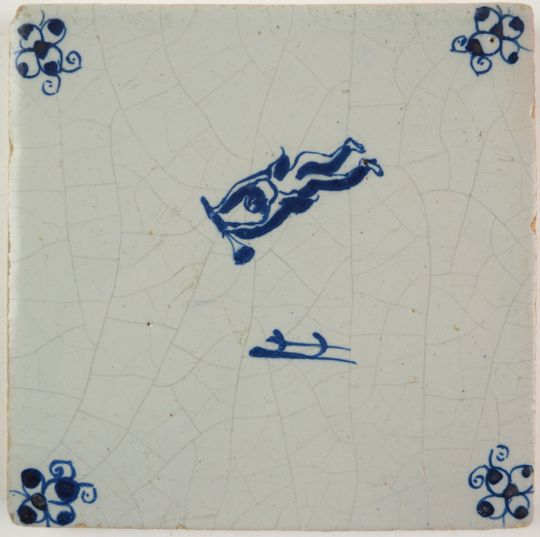 This antique Delft tile depicts Cupid in flight. He is holding a trumpet, which is one of the classic attributes of Cupid and/or Angels. The tile dates from around 1680 and is decorated with 'spider' corner motifs. It is in an excellent condition.