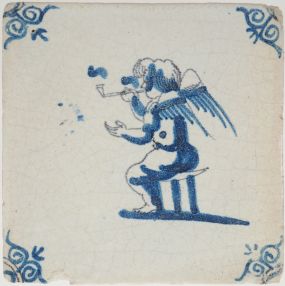 This antique Delft tile depicts a game of 'Knucklebones'. The game is known as 'Koten' in Dutch. The 'koot' was a piece of bone of a horse that had to be thrown in such a way that it did not land with its hollow side up. If it did and the opponent threw his 'koot' with the hollow side down, he would win the koot of the other player. It was a popular game for centuries, that eventually disappeared late in the 19th century. This tile dates from around 1660 and is decorated with 'ox-head' corner motifs. It is in a good condition with the normal superficial wear and chips along the sides, mainly on the top right corner.