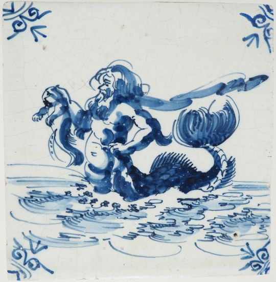 This exceptional Delft tile was made around 1660 in the Dutch city of Harlingen. Its production area is easily recognizable, as the cream white glaze and the dark shades of blue are characteristic for Harlingen. The tile depicts a fierce looking merman holding a very young baby boy. It comes with quite an entertaining extra as the small child is actually peeing. The tile is decorated with 'ox-head' corner motifs and is in a good condition. It has minor restorations on the tips of the lower corners and a more significant restoration on the top right corner.