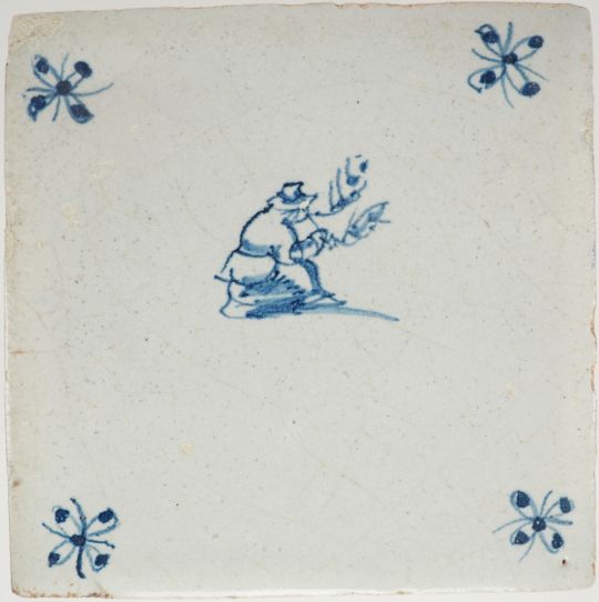 The man captured on this Delft tile enjoys a tobacco pipe. He is clearly relaxed as he sits on some sort of stone of hay bale. The tile was made around 1660 and is decorated with an early version of the 'spider' corner motif. The tile is in a great condition.