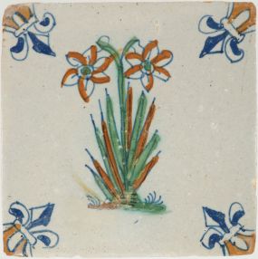 This 17th century Delft tile depicts one of the rarest corner motifs known. The 'fleur-de-lis' corner motif with an unique two-tone motif on the corners. This in combination with the very pretty and colourful ostrich in the center, makes this an incredible tile. It was made around 1640 and is a good condition. Note that the lower side, including most of the two corner motifs, has been restored.