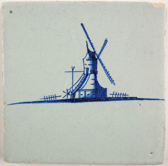 This 17th century (c. 1680) Delft tile depicts one of the icons of the Netherlands; a well-painted and detailed post mill. The earliest type of the European windmill. The tile is in a good condition with a small chip on the top right corner.