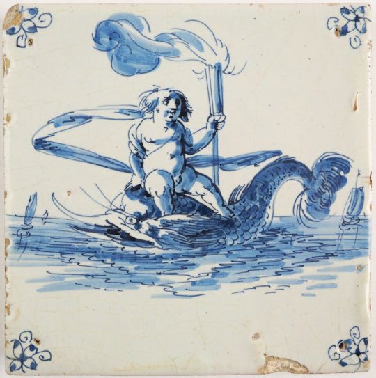This antique Delft tile dates from the 17th century (c. 1660) and was most likely made in the Dutch city of Amsterdam. It shows putti, with great similarties with the Roman goddess Venus, on a dolphin. The putti is holding a burning torch while a thin veil waves through the air. The tile is in a good condition with a bright and smooth glaze. It has the normal superficial wear and chips one may expect after 360 years.