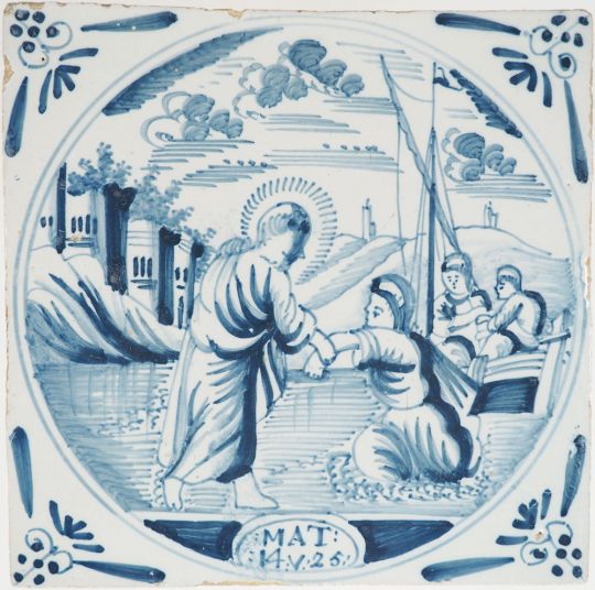 This rare antique Delft tile depicts the iconic Biblical scene in which Jesus walks on water and saves Peter (Matthew 14 verse 25). The tile was made around 1790 by the well-documented artist Adam Sijbel at the time he worked for pottery Kingma in the Dutch city of Makkum. It is decorated with 'ox-head' corner motifs and overall in a very good condition with a beautiful glaze.