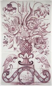 This colourful Delft tile mural depicts a richly decorated flower vase with beautiful flowers. The scene is captured on six tiles and is highly decorative to use for restoration or interior design projects. The mural is in a very good condition with just one glued fracture on the lower left tile and the lower left corner. The mural was made around 1880 in the Dutch city of Harlingen. It was painted by Joseph de Witte.