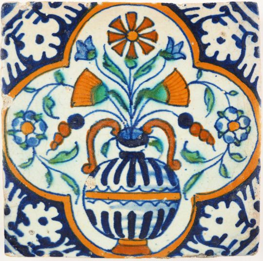 This antique Delft tile dates from the very beginning of the 17th century; the Dutch Golden Age. It was made around 1620 and is as thick and solid as a floor tile. It depicts a colorful flower pot, with all sorts of flowers. The decorative borders with 'corners in reserve' are typical for tiles made during this time period. The tile is after 400 years still in an excellent condition.