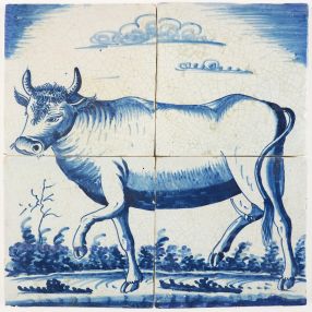 This is an early 19th century (.c 1820) Delft tile mural with a cow facing to the right. The mural was made by pottery Royal Tichelaar in the Dutch city of Makkum. It can be combined with a mural of the same type depicting a horse. It can be found here. A photo of the the murals together has also been added.