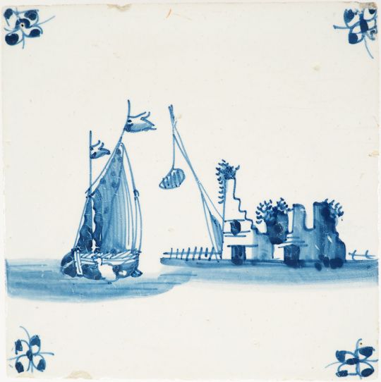 This Delft tile was made around 1700 and depicts a cargo boat under sail. In the background a fire beacon (not burning) is shown. It is placed probably on a small island with a few ruins. The fire beacon is there to alarm approaching boats and ships to not get stuck on shore. The tile is decorated with 'spider' corner motifs and is overall in a very good condition with a beautiful glaze.